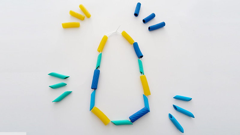 Join Spot, Mia, Theo, Dotty, and Boo in their world of crafts. They love making things using simple items you’re sure to have at home. This pasta necklace is fun to make, pretty to wear and a great way to practice those important motor skills!